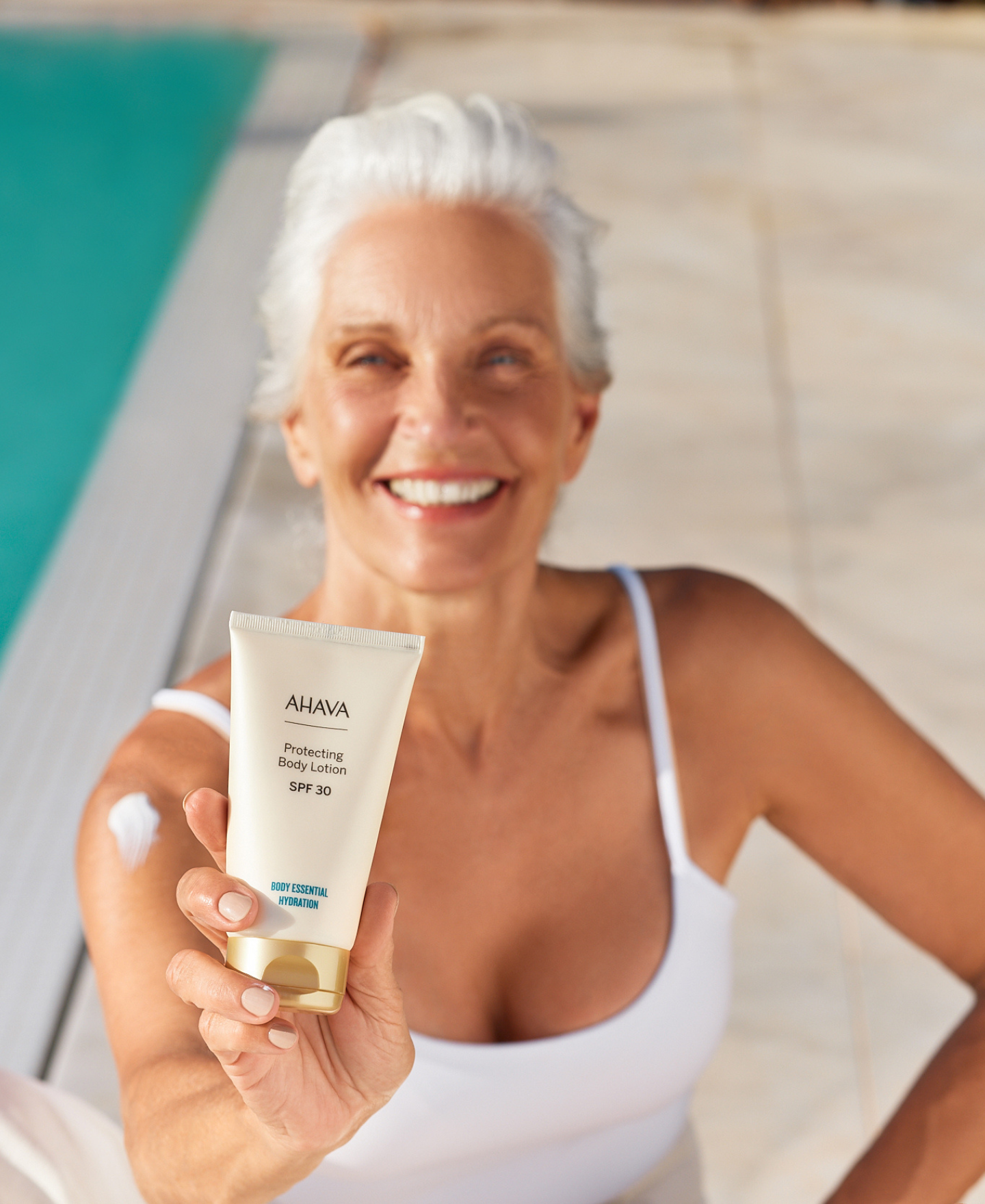 La lotion corporelle protectrice AHAVA SPF 30, douce comme de la soie, hydratante et protectrice, garde la peau souple et en sécurité tout au long de l'année lorsque vous êtes exposé aux rayons du soleil. Formulée avec l'Osmoter™ exclusif d'AHAVA, qui augmente le taux d'hydratation de la peau de l'intérieur, ainsi que des super-aliments antioxydants comme l'Acai et le café, pour protéger la peau contre les premiers signes de vieillissement dû à la lumière. L'unicité de la formule se reflète dans la texture – légère, nourrissante et offrant une très haute protection UVA/B, sans sensation de lourdeur ou de collant que l'on trouve souvent dans les produits à indice de protection solaire élevé. Végane, sûr pendant la grossesse, sans alcool, OGM ni parabènes.