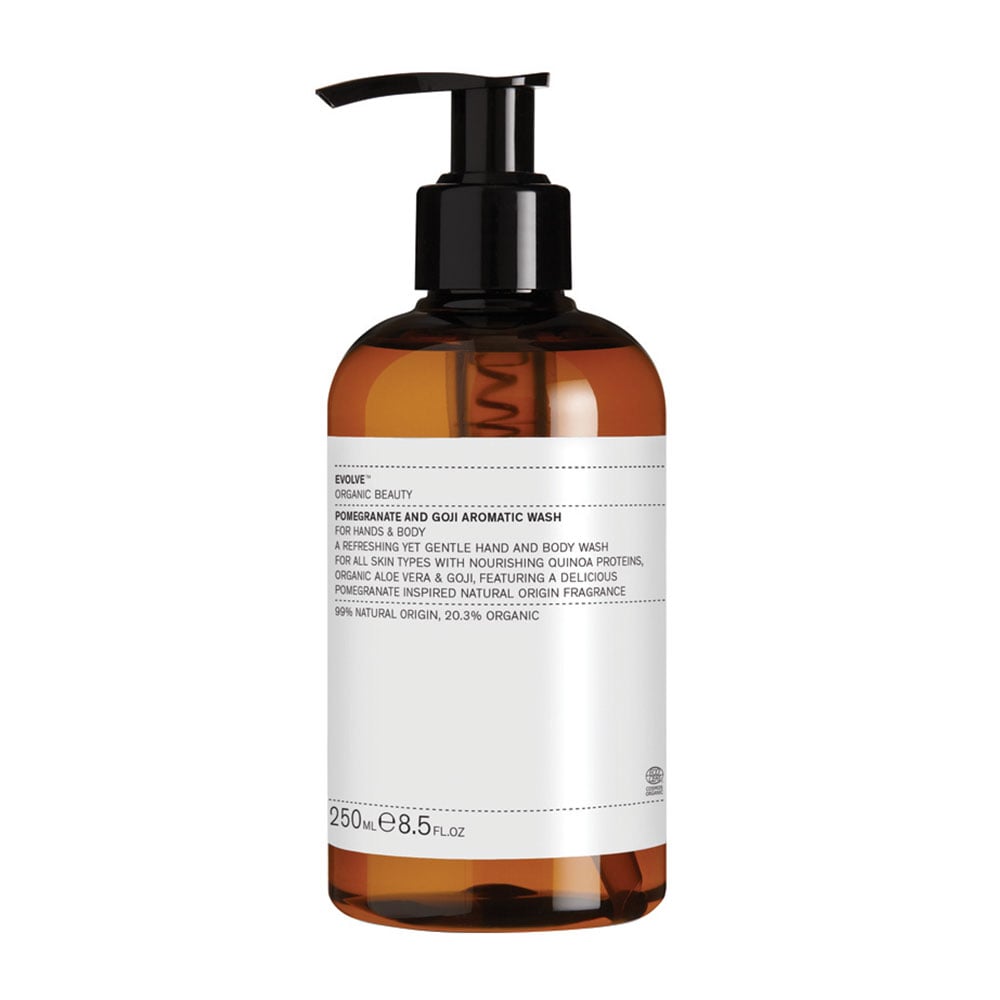 Le Pomegranate and Goji Aromatic Wash d'EVOLVE est un gel douche ou un savon pour les mains merveilleusement parfumé aux fruits et rafraîchissant. La formulation nettoyante est particulièrement douce pour la peau et prend soin grâce à l'Aloe Vera et au quinoa hydratant. La peau est nettoyée en douceur mais en profondeur, sans que sa barrière de protection ne soit altérée. Un parfum fruité et frais de grenade, poire, pêche, framboises et agrumes diffuse une bonne humeur et apporte une nouvelle énergie. Convient à tous les types de peau. Vegan.