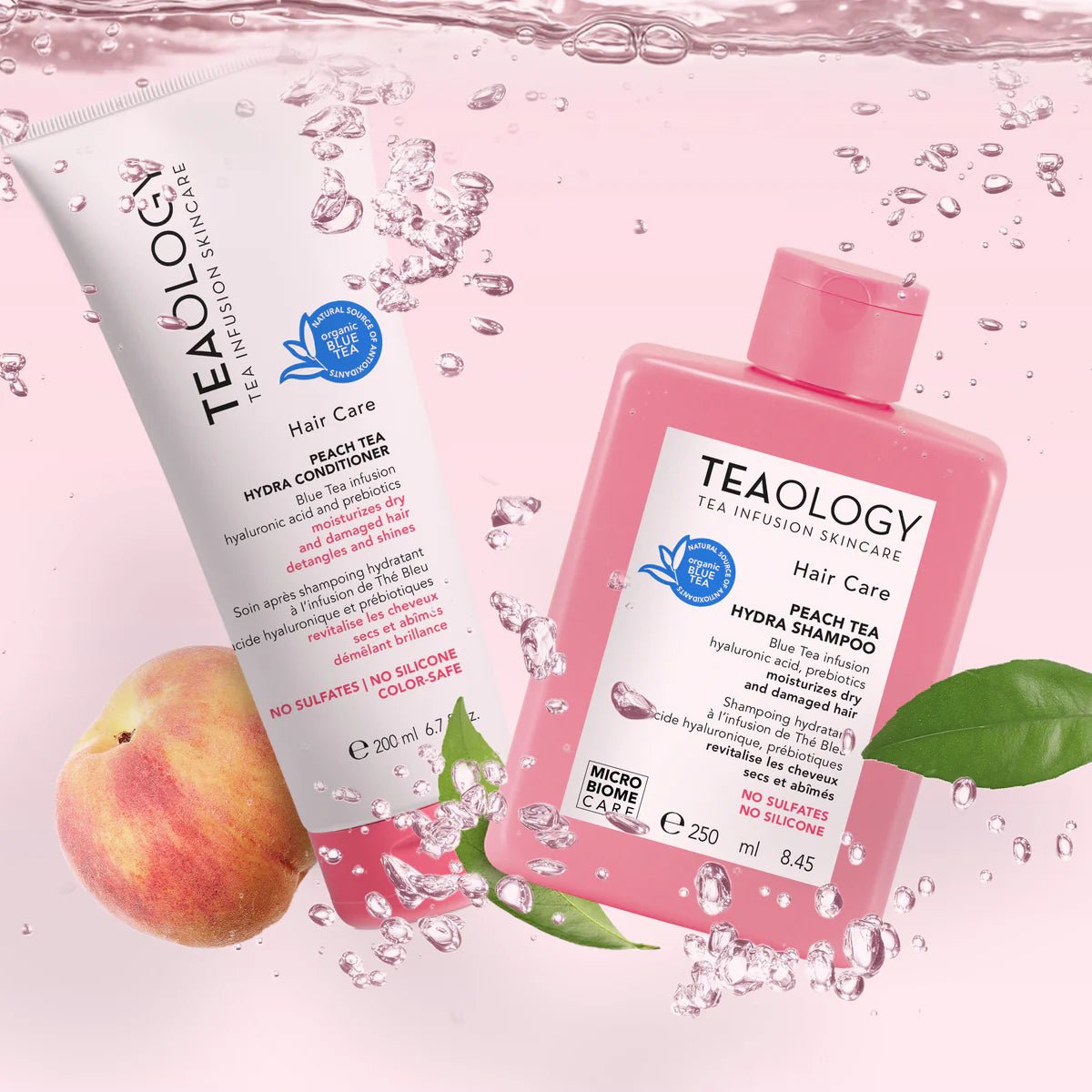 Der Peach Tea Hydra Conditioner von TEAOLOGY Die fortschrittliche, Sulfat- und Silikon-freie Formulierung enthält eine Infusion von blauem Tee anstelle von Wasser, Hyaluronsäure und Probiotica und pflegt auch Farb-behandeltes Haar sicher und ohne es auszubleichen. Der kraftvolle Creme-Conditioner glättet, entwirrt, stärkt und revitalisiert durch Hyaluronsäure der nächsten Generation, entwickelt, um das Haar auch nach dem Ausspülen weiterhin gut hydriert zu erhalten. Antioxidantien und klinisch bestätigte Tee Infusion schützt gegen Verschmutzung und Trockenheit, hydriert und bewahrt die Lebhaftigkeit von Locken. Nährendes Kameliensamenöl verbessert den Glanz und bekämpft Haarbruch mit Unterstützung eines probiotischen Komplexes, der zusätzlich die Kopfhaut stärkt und die Haarvitalität steigert. Italienischer Pfirischextrakt sorgt für einen frischen, allergenfreien Duft und pflegt das Haar seidig und leichter kämmbar. Für jeden Haartyp geeignet. 97% naturaliche Inhaltsstoffe. Vega. Biologisch abbaubar. Dermatologisch und Nickel getestet.