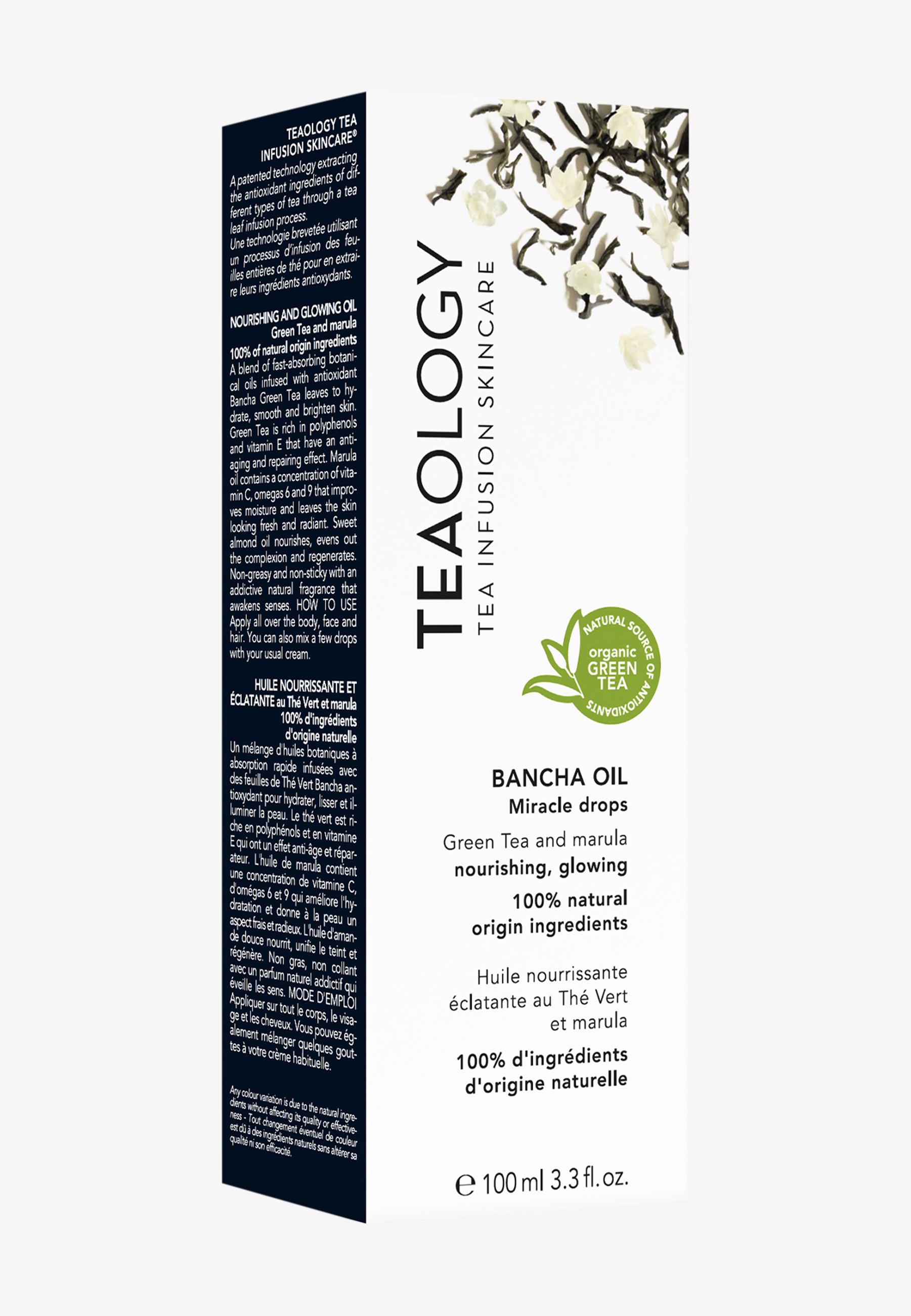 L'huile multi-talent Bancha Oil de TEAOLOGY est un mélange d'huiles végétales précieuses, enrichi de véritables feuilles de thé vert Bancha. Les feuilles sont utilisées pures après le pressage à froid, révélant ainsi leurs propriétés hydratantes, élastiques et éclaircissantes. Cette huile de beauté n'est pas grasse, ni collante, pénètre rapidement et peut être appliquée sur le corps, le visage et les cheveux. Appliquez quelques gouttes sur un coton ou dans la paume de la main. Appliquez sur le visage et le cou secs en tapotant doucement pendant au moins une minute. Utilisez matin et soir, après le nettoyage de la peau et à tout moment de la journée pour redonner à votre visage un éclat naturel. CORPS : Soin après-soleil pour améliorer le bronzage, sur la peau gercée pour protéger et régénérer, sur les mains et les pieds pour les garder doux. Ajoutez quelques gouttes dans l'eau du bain pour adoucir la peau. VISAGE : Pour un effet hydratant efficace et anti-âge. Ajoutez une goutte à votre fond de teint pour un effet nourrissant, sur les lèvres avant d'appliquer le rouge à lèvres pour les hydrater ou pour mettre en valeur les pommettes et l'arc de Cupidon. CHEVEUX : En tant que masque restructurant avant le shampooing, sur cheveux mouillés pour protéger lors du coiffage ou sur cheveux secs pour réparer les pointes et lutter contre les frisottis.