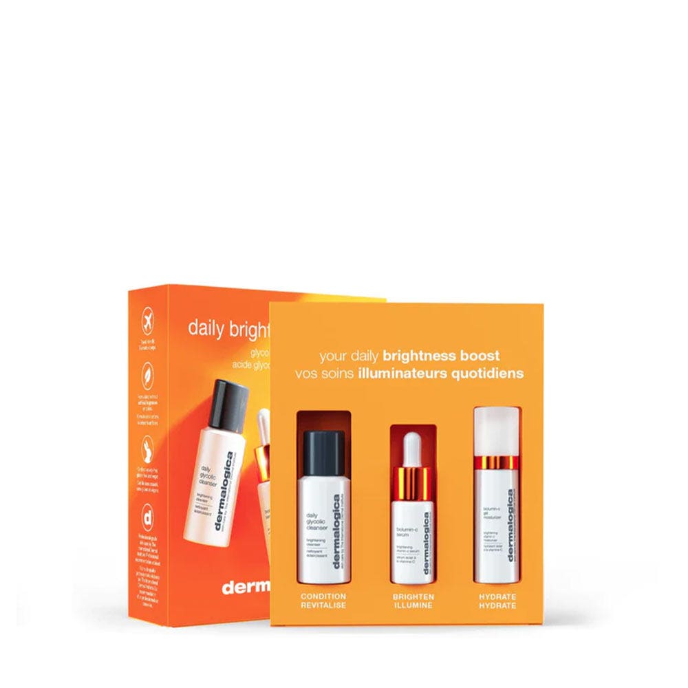 Découvrez le set de soins du visage Daily Brightness Boosters de dermalogica - un soin à la vitamine C qui donne à votre peau un aspect éclatant et jeune. Les ingrédients hautement efficaces, y compris le sérum Biolumin-C, sont spécialement conçus pour renforcer l'éclat naturel de votre peau et réduire les ridules ainsi que les taches pigmentaires. L'effet antioxydant du sérum riche en vitamines protège votre peau des agressions environnementales et soutient la régénération cutanée.
