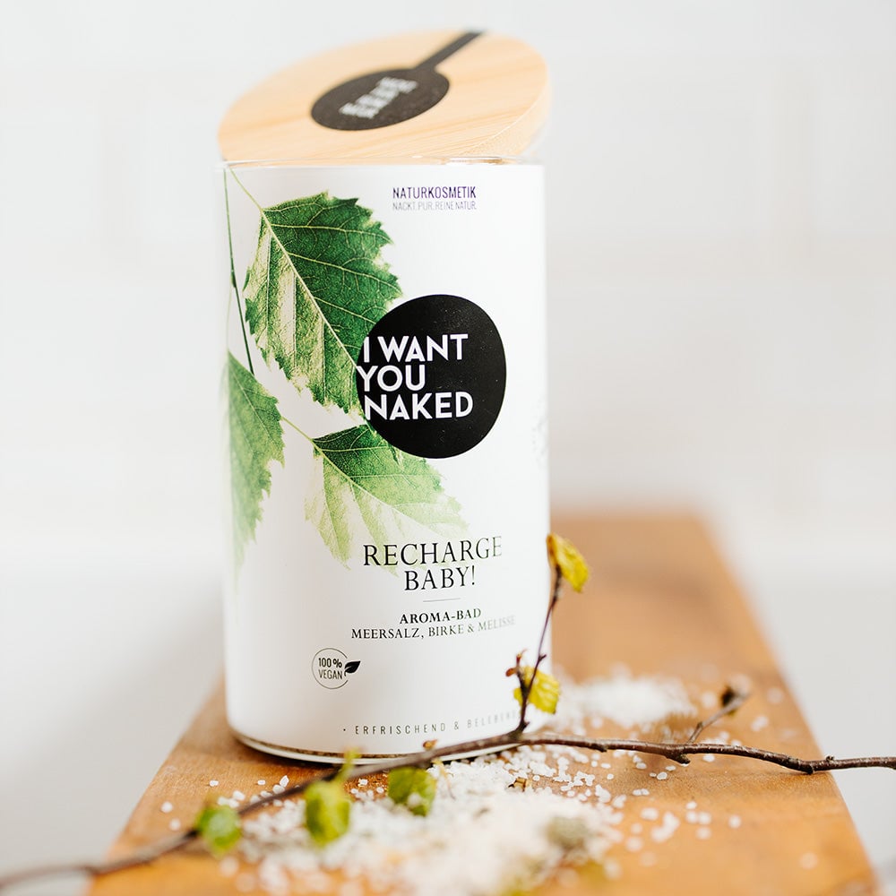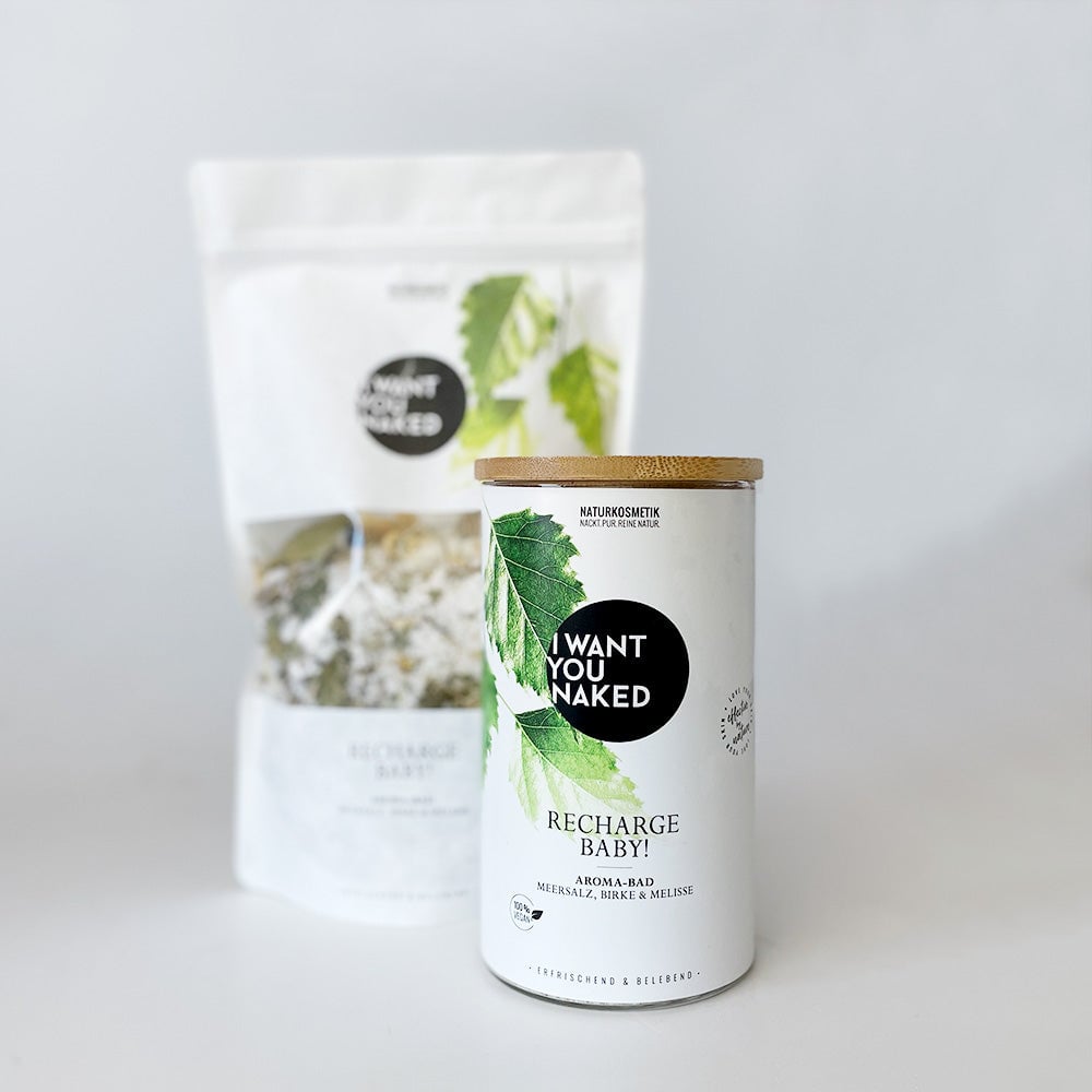 Ce bain est votre batterie personnelle. Rempli d'ingrédients énergisants issus de la nature. Alors plongez dans ce bain rafraîchissant et vous en sortirez activé et plein d'entrain, prêt à sauver le monde. Le sel de mer riche en minéraux recharge vos réserves. La vitamine C renforce et libère de nouvelles forces. Le bouleau, la mélisse et le souci ont un effet raffermissant et activant, vous donnant à vous et à votre peau un coup de fouet. "RECHARGE BABY" Bain aromatique au sel de mer, bouleau & mélisse de I want you naked offre à votre esprit et à votre corps une nouvelle énergie grâce à la combinaison de puissantes plantes médicinales. Comparé à un additif de bain classique, le sel de mer contenu hydrate votre peau et régule la protection acide naturelle. Votre peau sera activée, rafraîchie et renforcée. Bain aromatique au sel de mer, bouleau & mélisse est 100% naturel, sans parfums, colorants et conservateurs synthétiques, silicones, paraffines ou matières premières à base d'huiles minérales. Contenu fantastique, emballé de manière durable. Ce bain aromatique est conditionné dans un joli verre avec un véritable couvercle en bambou. Trop beau pour être jeté : n'hésitez pas à le réutiliser et à commander nos pratiques packs de recharge.